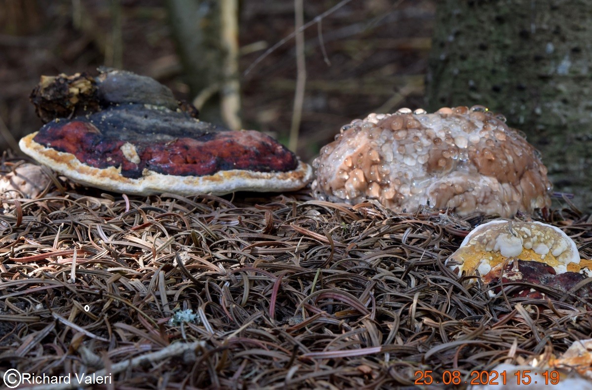 Le polypore marginé, grosse espèce courante, souvent sur bois mort de conifère, les jeunes exemplaires montrent souvent des gouttelettes caractéristiques. Arconsat (63).